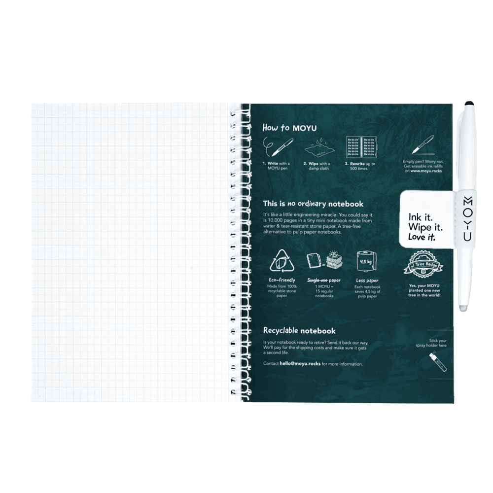 Uitwisbaar steenpapier is een duurzaam alternatief voor single-use paper. Het voelt en schrijft als normaal papier, met het voordeel dat je de inkt vlekkeloos kan uitvegen en tot wel 500 keer kan herschrijven. Één MOYU vervangt gemiddeld 15 reguliere notitieboeken en gaat jaren lang mee.