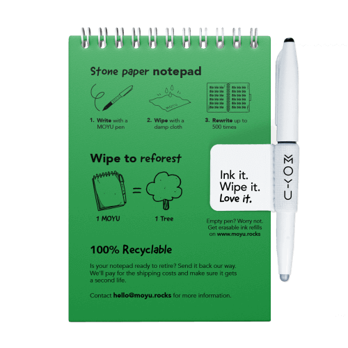 Ervaar de magie van uitwisbaar steenpapier. Een duurzaam alternatief voor single-use paper. Het voelt en schrijft als normaal papier, met het voordeel dat je de inkt vlekkeloos kan uitvegen en tot wel 500 keer kan herschrijven. Één MOYU vervangt gemiddeld 15 reguliere notitieboeken en gaat jaren lang mee.