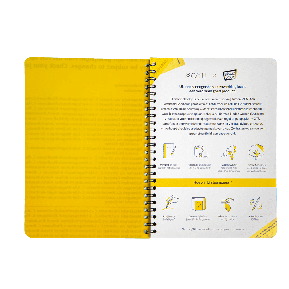Er zijn géén hout en water nodig voor de productie van ons steenpapier: uiterst duurzaam dus. Door de unieke eigenschappen van steenpapier zijn Moyu boekjes scheurbestendig, waterafstotend en tot wel 500x herschrijfbaar. Eén Moyu notitieboek staat dus gelijk aan zo'n 500 papieren notitieboekjes. Tel uit je winst en de winst voor de natuur!