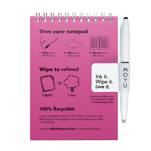 Ervaar de magie van uitwisbaar steenpapier. Een duurzaam alternatief voor single-use paper. Het voelt en schrijft als normaal papier, met het voordeel dat je de inkt vlekkeloos kan uitvegen en tot wel 500 keer kan herschrijven. Één MOYU vervangt gemiddeld 15 reguliere notitieboeken en gaat jaren lang mee.